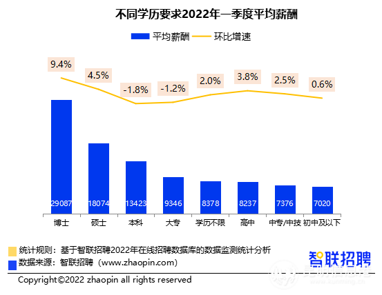 从学历要求看,一季度博士的平均招聘薪酬最高,为29087元/月。硕士次之,为18074元/月。本科为13423元,大专为9346元/月,高中为8237元/月,要求初中及以下学历的岗位平均招聘薪酬为7020元/月。