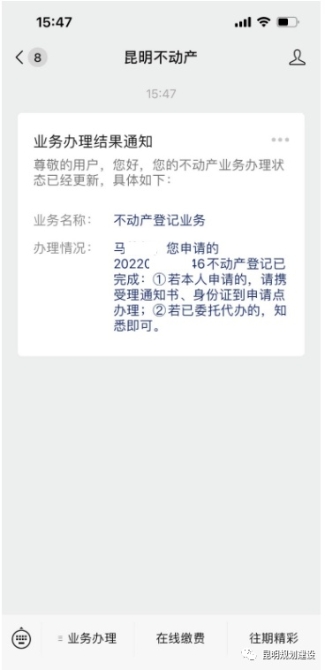 第二步:申请办理登记后,“昆明不动产”微信公众号会向您推送以下信息