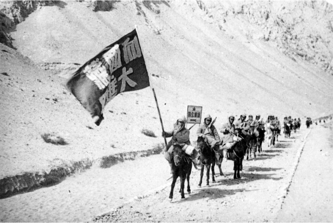 进藏先遣连高举红旗向西藏阿里进军。新华社发