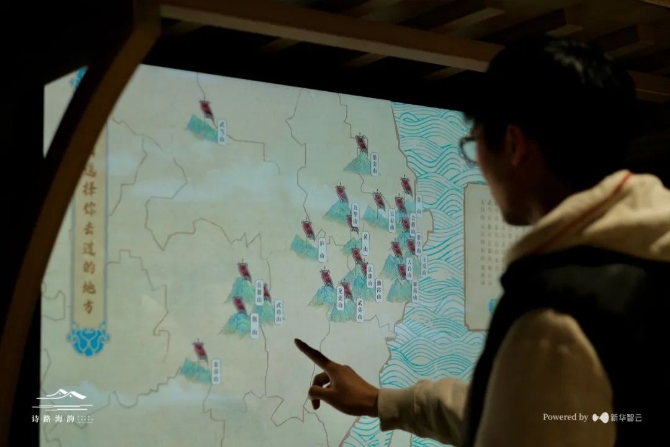 诗路海韵·唐诗之路宁海数字馆以“行万里路、读万卷书”为核心意象,以“三个一”的技术特点,即一个文旅大数据平台,一张数字化的游客导引网络,一群生动活泼的数字化文创产品,是浙东唐诗之路上独具一格的“海韵”新地标,旨在信息化、数字化的时代浪潮下,讲好宁海故事、呈现宁海气质。馆内第一次运用360环拍机器人,第一次出现声音机器人,第一次创造出四幕“小剧场”,此外运用AI等多种数字技术打造了“霞客日历”“潘天寿的朋友圈”“学子祈福”等多个数字展项,希望向今人呈现三位名士的风骨与气质,增加他们对文化遗产、对诗意生活的美好体验。