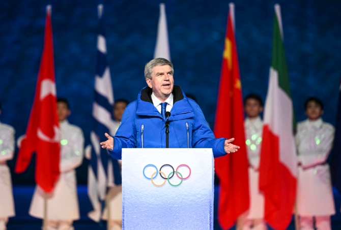 2月20日晚,北京第二十四届冬季奥林匹克运动会闭幕式在国家体育场举行。这是国际奥委会主席巴赫在致辞。新华社记者李尕摄