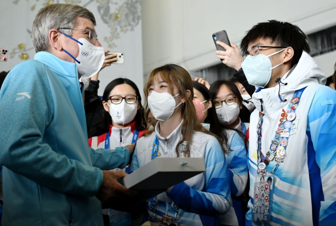 2月18日,国际奥委会主席巴赫来到北京2022年冬奥会主媒体中心,与志愿者交流互动。新华社记者李一博摄