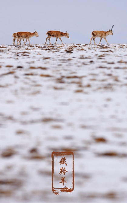 ↑2021年4月20日,在青海可可西里国家级自然保护区,一群藏羚羊向卓乃湖方向行进。