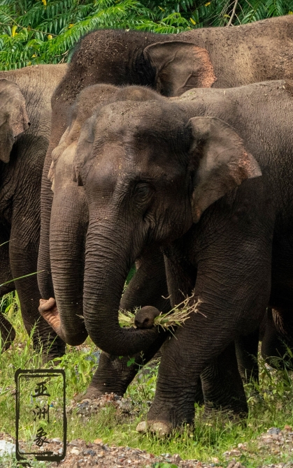 ↑2021年8月9日,亚洲象群在云南省玉溪市元江县境内的丛林中觅食。