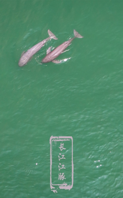↑2021年5月11日,在湖北省宜昌市江边,长江江豚在水中嬉戏。