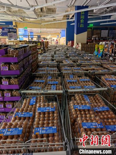 上海,盒马X会员店内,深夜到货待发的必须生活物资。鸡蛋,在购物车中排成长队。 盒马供图