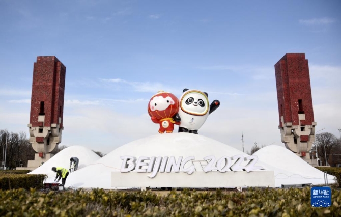 这是2022年1月12日在北京奥林匹克景观大道拍摄的北京2022年冬奥会和冬残奥会吉祥物“冰墩墩”“雪容融”。新华社记者 李欣/摄
