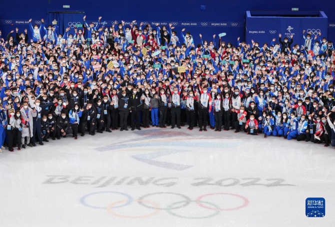 2022年2月20日,工作人员和志愿者在北京首都体育馆举行的北京冬奥会花样滑冰表演滑后合影留念。新华社记者 王毓国/摄