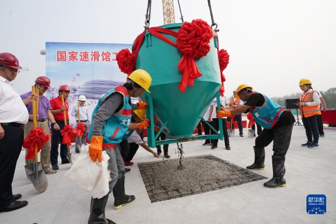 2018年6月26日,在北京国家速滑馆施工现场,工人浇筑地下结构最后一块顶板混凝土。新华社记者 鞠焕宗/摄
