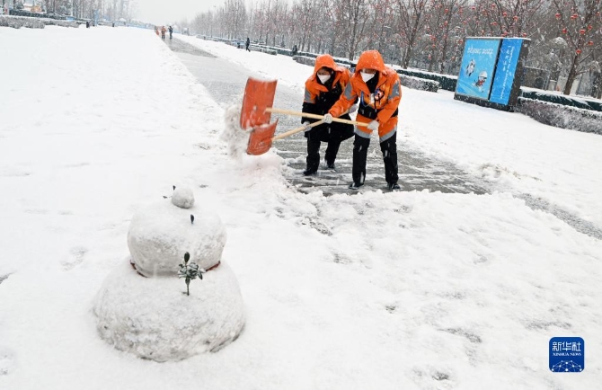 2022年2月13日,工作人员在北京冬奥会和冬残奥会主媒体中心外清扫积雪。新华社记者 武巍/摄