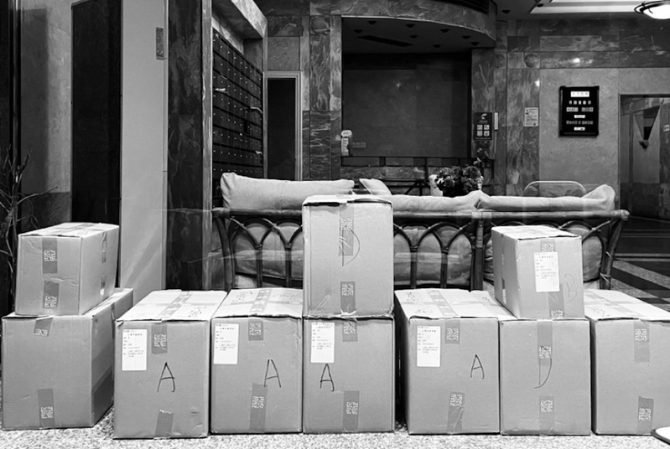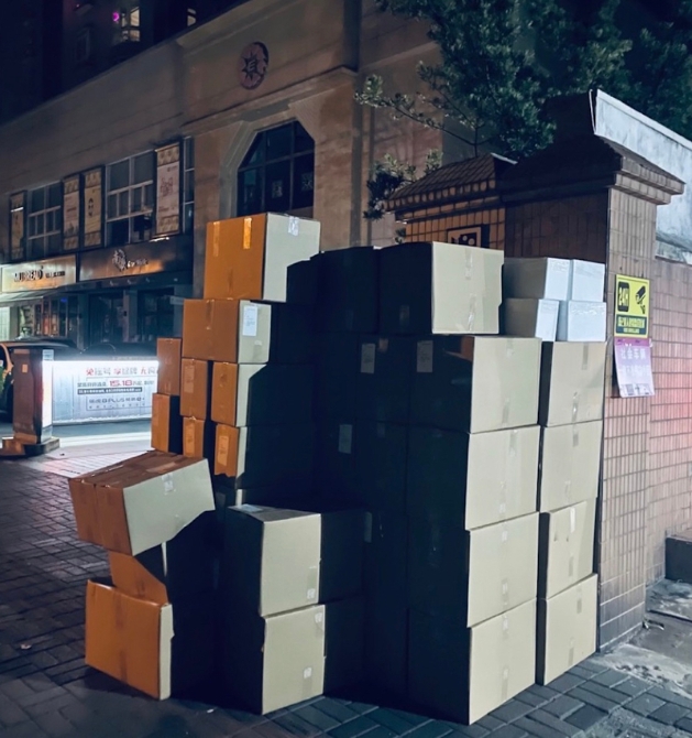 小区只有一台很小的手推车,我和小罗负责将物资送上楼,给各家住户。另外一队负责将物资按照订购清单,在纸箱上做记号,并挪到大堂门口以方便我和小罗运送。