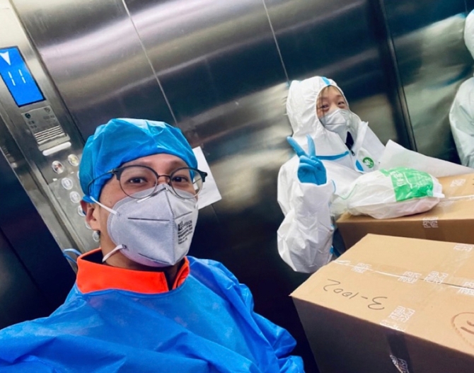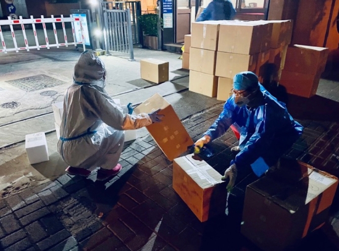由于我们衣服穿得有点多,加上防护服和口罩,来回搬运以及在电梯里的时间久了,连续多天辛苦工作的小罗终于感到身体受不了,开始头晕并蹲坐在电梯里。我赶紧分发完物资,让她先坐在三号楼的大堂休息,我和另一位志愿者周平老师继续负责运送。