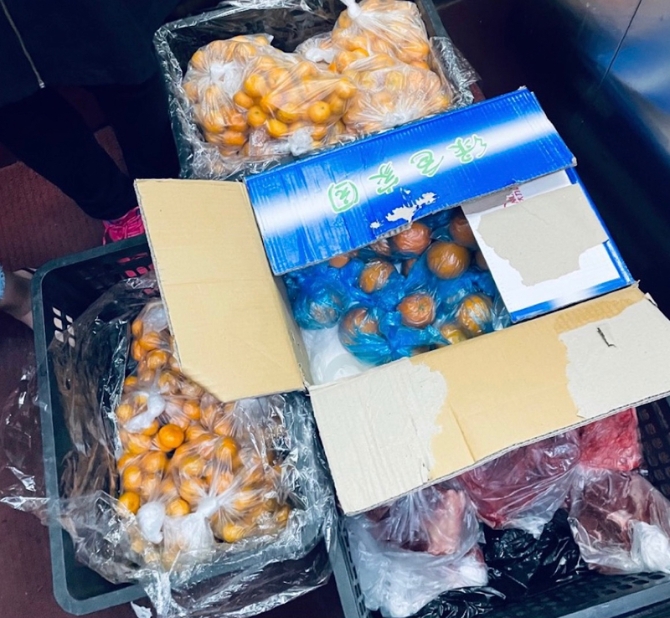 我和小罗这一组一般从底楼开始分发。一方面怕物资放在门外过夜,会影响品质;另一方面又担心半夜敲门吵醒邻居,不太合适。最后我们决定,物资里有鱼、有鸡的住户,就尽量多敲几下门;只有蔬菜的住户,轻轻敲一两下就结束。