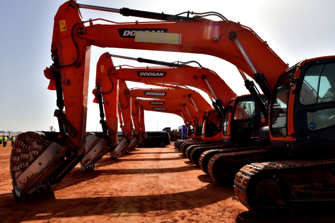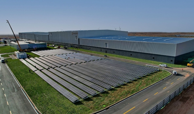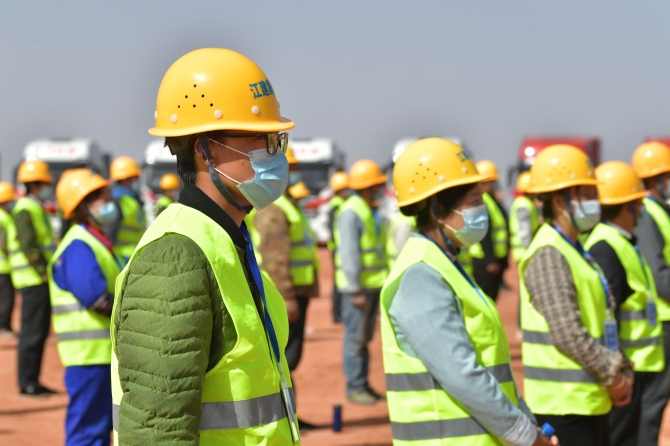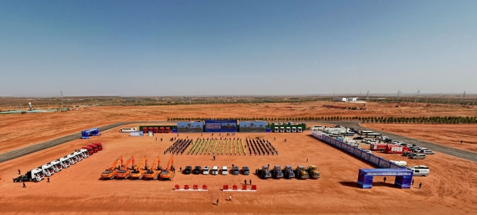 伊金霍洛旗蒙苏经济开发区的隆基绿能科技股份有限公司电池工厂施工现场,几十辆大型挖掘机、推土机、工程车一字排开整装待发,十几块大型展板巍然矗立格外醒目,内蒙古自治区2022年推进高质量发展重大项目建设动员大会在这里隆重举行。