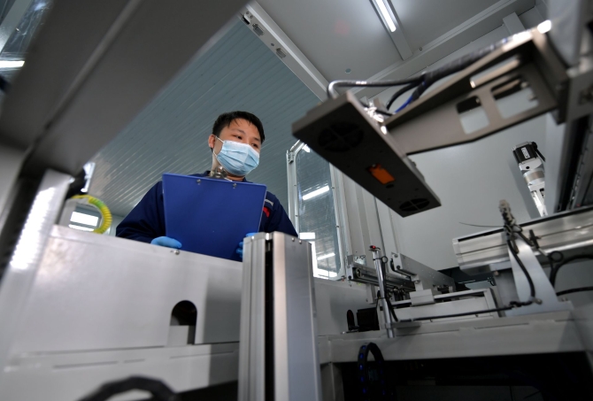 美锦国鸿氢能科技产业园的工作人员正在进行双极板上料。记者马建荃/摄