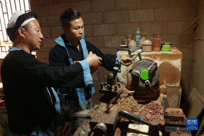 谢友明(左)跟徒弟在赶制陀螺(4月6日摄)。新华社记者齐健/摄