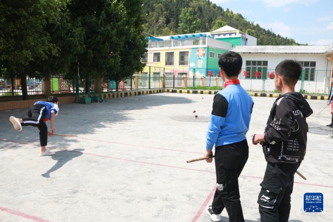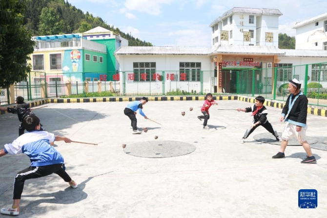 瑶山民族小学的学生在练习竞技陀螺(4月6日摄)。新华社记者齐健/摄