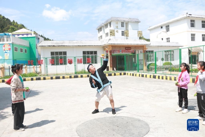 谢友明(中)在给瑶山民族小学的学生表演花式陀螺(4月6日摄)。新华社记者齐健/摄