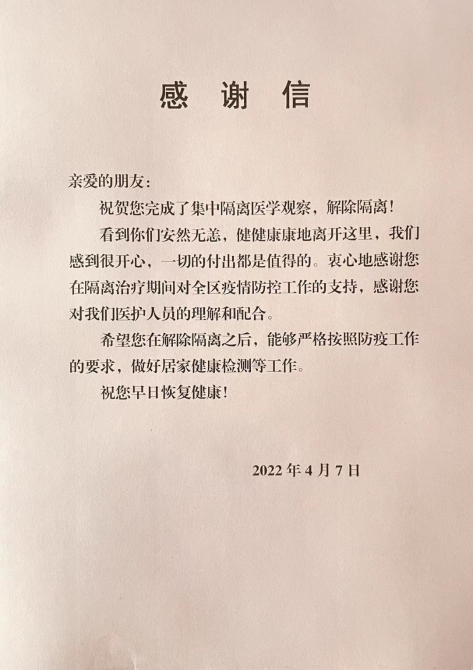“希望您在解除隔离之后能够严格按照防疫工作的要求,做好居家健康检测等工作,祝您早日恢复健康。”当护士长严晓晴念完感谢信时,傅先生激动地说:“感谢你们医务人员的付出,我家人都是做医生的,所以我知道当医生很辛苦,真的非常感谢你们!”