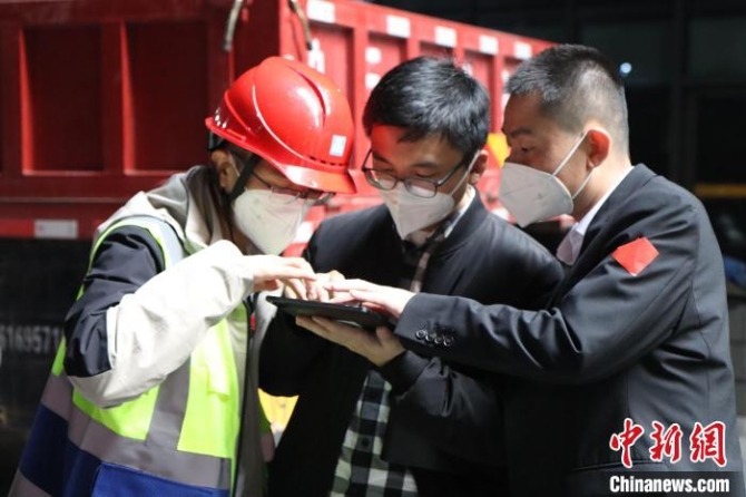 中建三局负责收治点污水处理系统工程技术负责人刘军(右一)在施工现场 中建三局供图