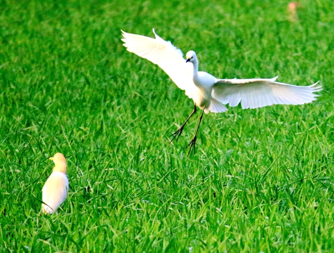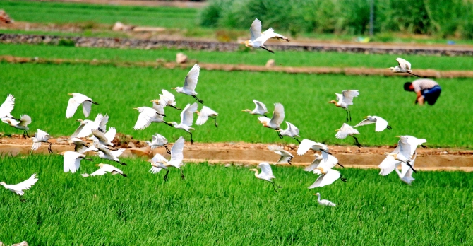 清晨,在县城城郊坝子里的田间地头,成群结队的白鹭在稻田里觅食,时而站成一排在田埂上休息,时而互相追逐打闹,人鸟和谐共处美如画卷。