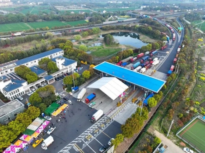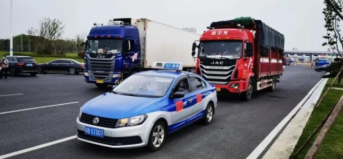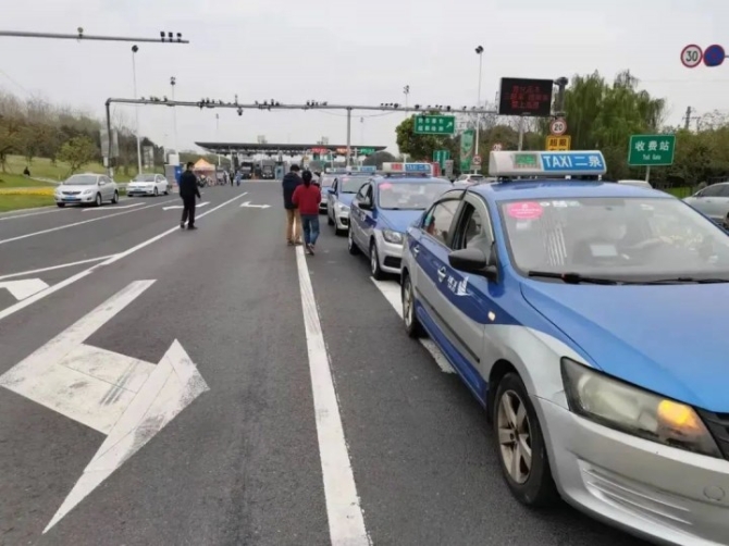 在无锡各高速卡口,可以看到不少出租车、商务车在道路一侧整齐有序地排成一列。和平时不同的是,司机们不是在等待载客,而是原地待命,时刻准备着驾驶着车辆,将外地来锡货运卡车送达目的地并最终护送出城。