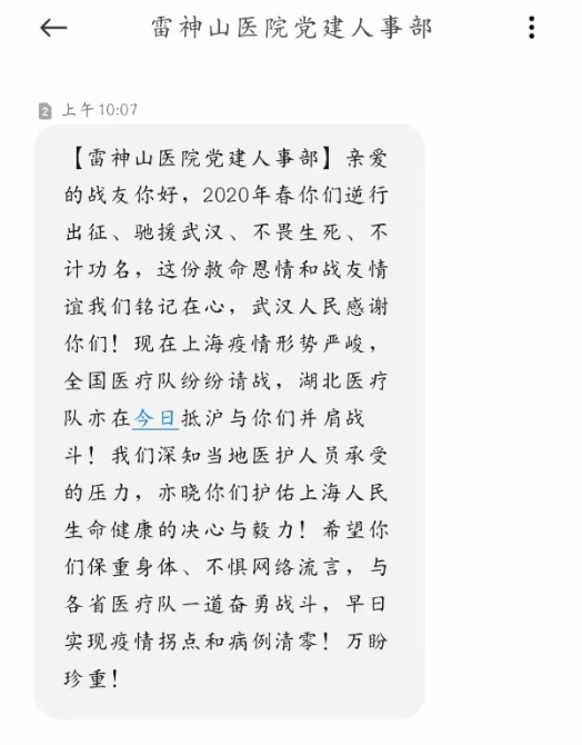 4月4日上午,在两年前驰援武汉雷神山医院的上海医护人员收到了一条来自“雷神山医院党建人事部”的短信,很多人此时正奋战在上海阻击疫情的第一线,看到消息的那一刻纷纷破防。“虽然不舍得您,但在同一个地方一起抗疫,也是万般不舍中值得庆幸的了。”彼时,还在新国际博览中心方舱医院N3舱战“疫”的龙华医院医疗队员陆巍给“战友”、武汉大学中南医院的方燕红发去了消息。
