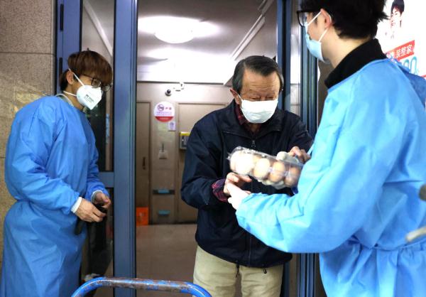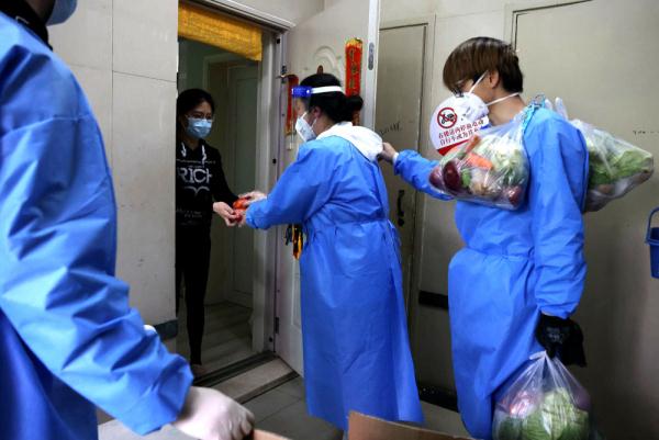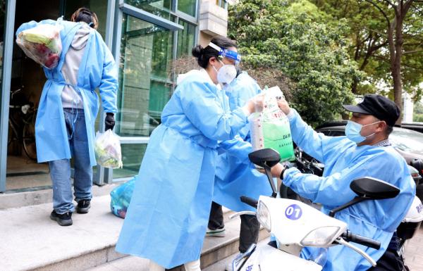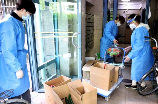 ↑4月11日,社区志愿者为居民挨家挨户运送生活物资。