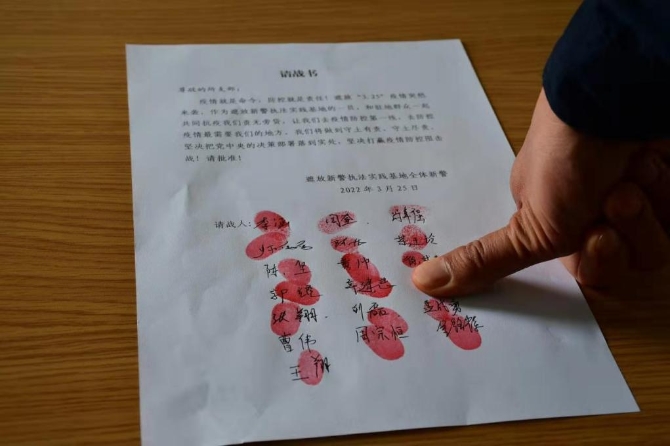 “我们郑重请求,在疫情防控危急时刻,作为一名共产党员,我自愿申请加入到抗疫战斗中去,为党和人民群众贡献自己的力量。”面对疫情,民警金铭辉等数十人主动请缨写下请战书,按下鲜红手印,强烈要求申请到抗“疫”一线去,一封封印着红手印的请战书,是共产党员的无所畏惧和忠诚担当。