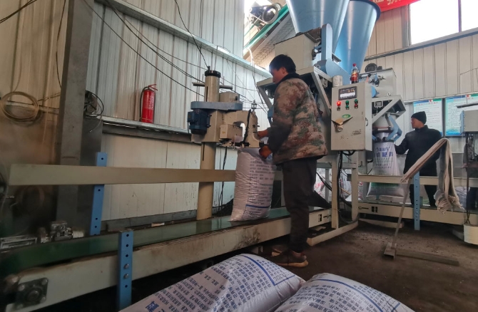川口村帮扶车间的工人正在将制作好的有机肥装袋。(新华社记者靳赫 摄)