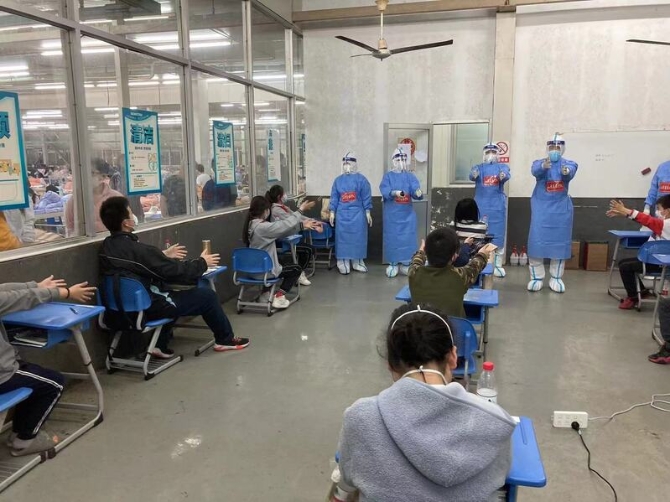 我走到方舱入口处,找到了接管石龙路方舱的山东援沪医疗队的滕医生,把在方舱内设置网课教室的想法告诉了他。滕医生当场答复说,会把我的建议上报给山东援沪指挥部。他让我统计下方舱内学生的数量,还领着我在方舱转了一圈,看哪处空间适合让孩子们上网课。