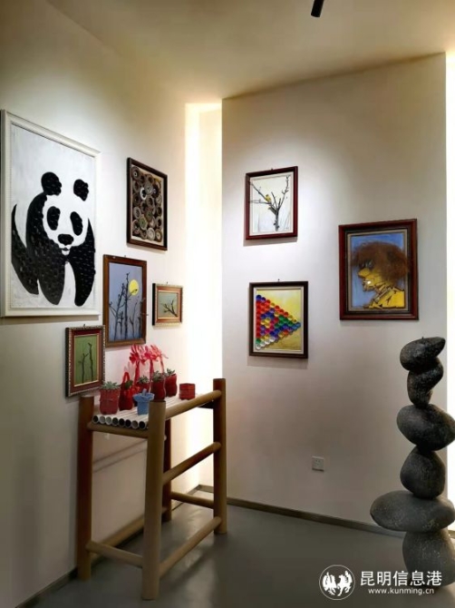 在垃圾分类体验馆门口,利用废铁制作的鹿体造型雕塑“毛渣渣”正抬头仰望嵌入房子的铁树。树的斑驳、鹿的仰望,构成一幅的渴望绿色、遥望家园的环保理念图景。再往里走,跟垃圾分类、废弃物回收再利用有关的科普知识展板遍布其中,一些用排水管、红酒塞、瓶盖等为原材料制作的小型画框,也让这些废弃物重新呈现出特殊的美感。