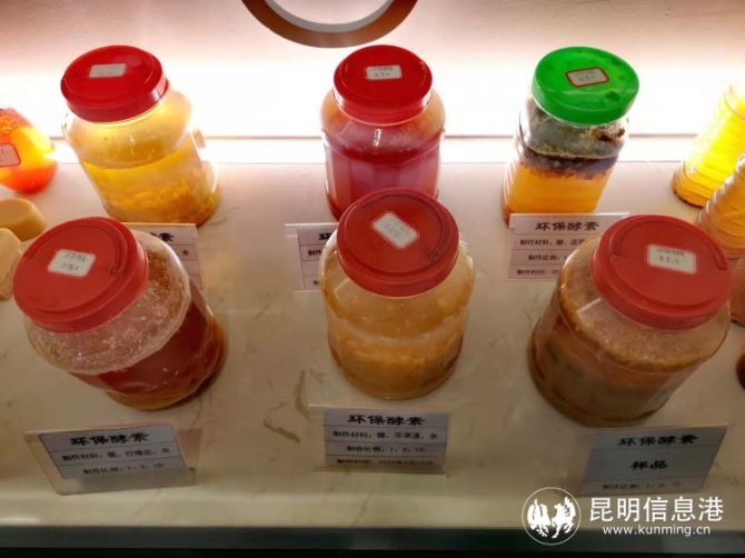 在体验馆内,最吸睛的还属回收厨余垃圾制作环保酵素的展区。厨余垃圾泛指易腐烂的、含有机质的生活垃圾。让厨余垃圾变废为宝的妙招就是“环保酵素”。将红糖、厨余垃圾和水按一定比例放入塑料桶里,3个月后就会变成具有抗氧化、抑菌、净化空气等作用的环保酵素,再经进一步加工,即可成为洗手液、洗面奶、香皂等日常生活用品。
