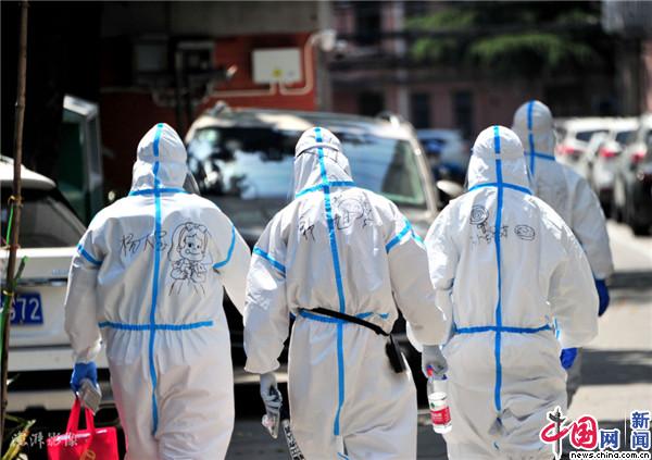资料图:2022年4月12日,申城最高气温达33度左右。烈日下“大白”志愿者值守社区岗位。澎湃影像