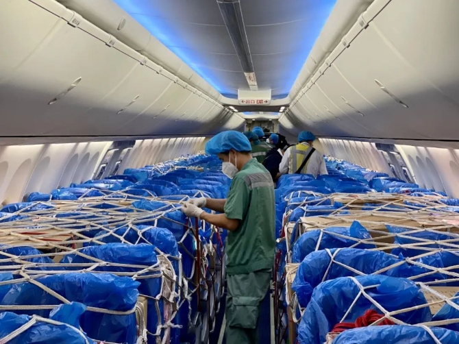 4月7日,福州长乐机场,厦航货物装卸人员正在固定客改货包机上的防疫物资。(厦航供图)