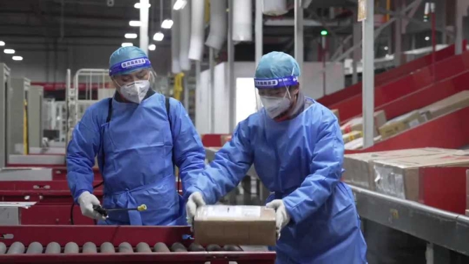 浦东机场工作人员正在对货物进行严格消毒。