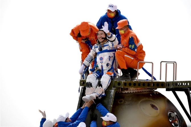 4月16日,神舟十三号载人飞船返回舱在东风着陆场成功着陆。这是航天员王亚平安全顺利出舱。新华社记者 彭源 摄