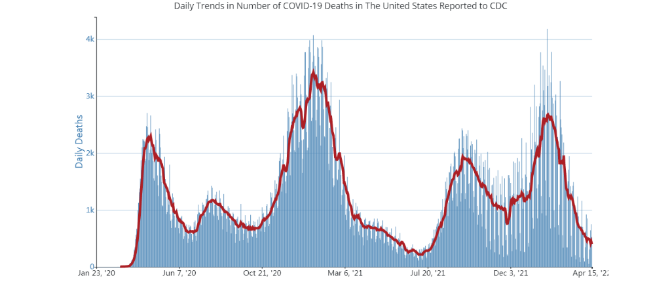 这是美国疾病控制和预防中心2022年4月16日公布的美国日增新冠死亡病例趋势图。(图片来源:美国疾病控制和预防中心网站)