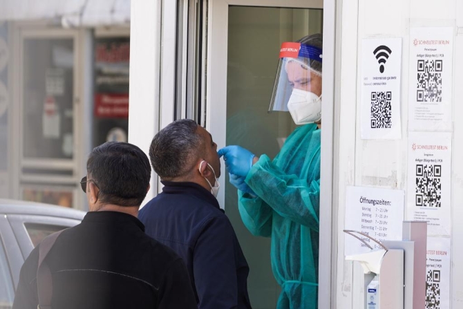 2022年3月24日,在德国首都柏林,一名新冠病毒检测站的工作人员为一名男子检测。(新华社发)