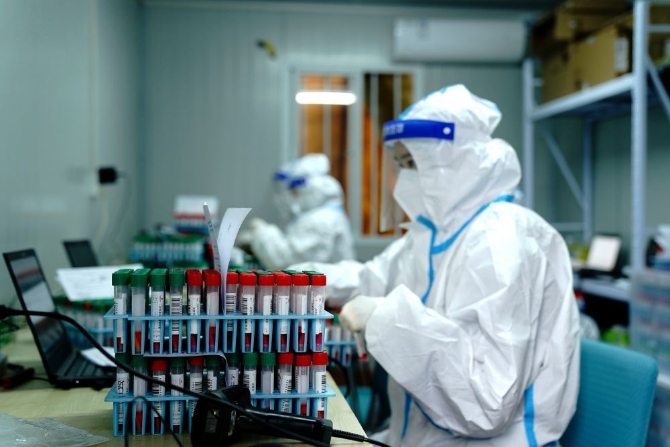 检测人员在迪安核酸检测气膜实验室里工作(新华社记者张建松摄)