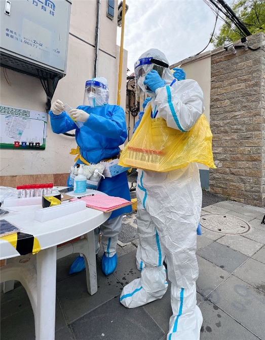 4月16日,长宁区周家桥街道周一居民区党总支书记张振海(右)准备陪同医务人员进行上门核酸检测采样。新华社发