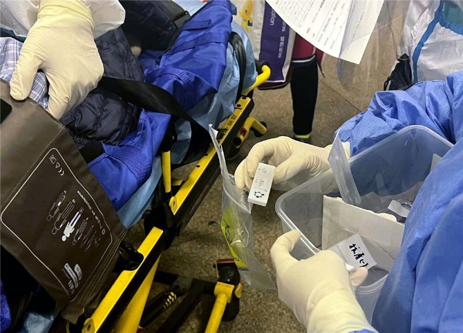 4月16日,复旦大学附属中山医院急诊大厅外,医护人员为患者进行抗原检测。新华社记者 袁全 摄