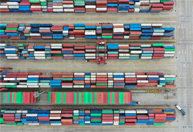 这是4月15日拍摄的上海洋山港集装箱码头(无人机照片)。新华社记者 丁汀 摄