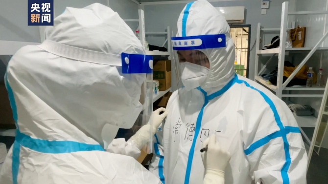 此次援沪,高东所在的医疗队主要接管上海凤凰实验室的2号大舱,每33人为一组,分为3组,每12小时轮转一班,全天开展核酸检测工作。高东在加样区,黄亚分在提取区,虽然两个工作区很近,但两人每天只能在入舱前见上一面。进舱前,他们都会为对方反复检查整理防护服,并在上面写下“加油”互相鼓劲。