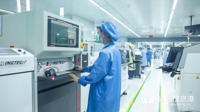 在闻泰科技昆明智能制造产业园,记者目睹了一台智能终端产品从无到有的全过程。据悉,昆明产投公司所属市产业基金出资55亿元参与闻泰科技非公开发行股票项目,成功引入闻泰科技有关产业落地昆明。闻泰科技昆明智能制造产业园(一期)项目于2021年7月正式投产,项目一期自开工到投产仅用一年时间完成,实现当年建设、当年投产。项目一期产能现已达到约120 万台/月,提供就业岗位4000余人,成为昆明市数字经济链主企业。目前项目二期正在建设推进中,目标在2022 年第三季度投产,一号厂房已于2022年1月23日完成封顶。