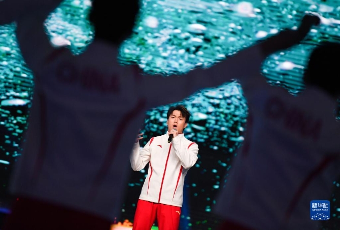 4月16日,自由式滑雪运动员齐广璞在活动中演唱。