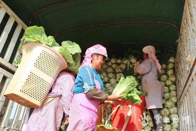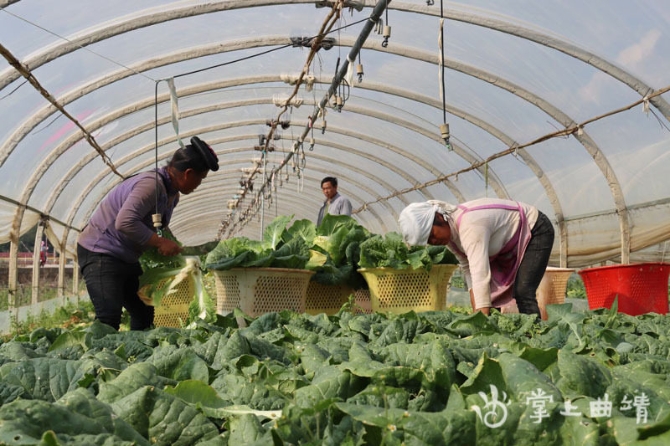 连日来,在马龙区通泉街道小寨居民小组蔬菜种植地,大棚里菜农忙着采收白菜、装车运输,一派繁忙的丰收景象。