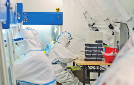 “气膜实验室对援沪医疗队是一个新的挑战。”杨祖顺说,队员们首次进实验室检测,有些不适应。医疗队随即以问题为导向,开展专业培训,定岗定责定操作,两天后,队员们已迅速进入状态,实验室运行井然有序。