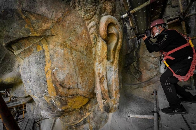 2022年4月13日,河南洛阳,龙门石窟卢舍那大佛,研究人员发现大佛额头处有贴金残留。视觉中国 供图