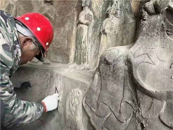 刘建社回忆,当时多数佛像“身上残缺很多,凹凸不平”。卢舍那大佛的脸部有一道很深的裂纹,右臂有脱落风险,整尊大佛和背后的岩体甚至有了分离。工人们需要填补造像本体上的空洞残缺,通过化学灌浆、砌石加固、钢筋铆杆支撑等方式,对其加固维修。